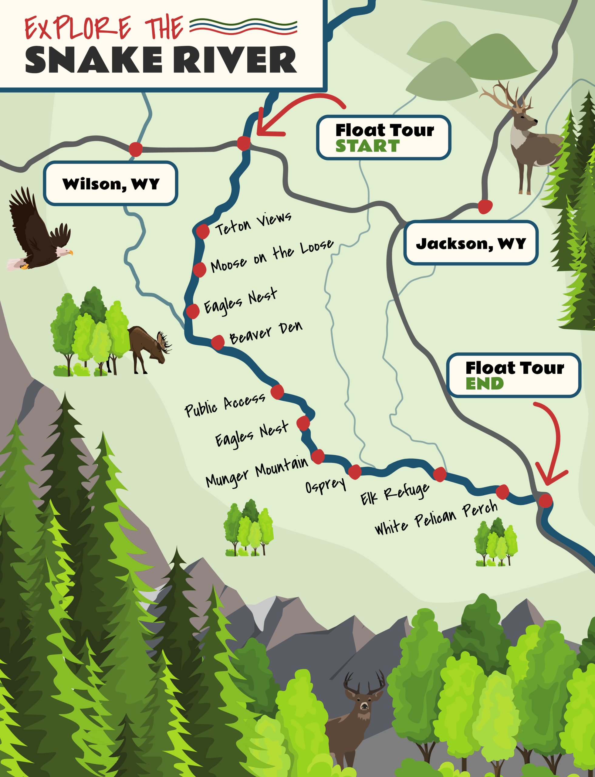 Enjoy the abundant wildlife with the Teton Mountain Range as a backdrop while your experienced guide does all the work! Bald eagles, pelicans, osprey, blue herons, and sandhill cranes are a few of the birds that are regularly seen on our trips. River otters, beavers, deer, elk, and moose also frequent the area. Water, sparkling water, and binoculars are provided for maximum comfort. Come explore the Snake River on a scenic float trip today!